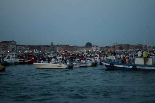 wir haben 2 einhalb sehr viele stunden zeit, es soll um 23:30 beginnen, die lagune füllt sich nach und nach mit hunderten von kleinen booten und gondeln und fischerbooten und polizeibooten und und, dicht an dicht, alles, was schwimmen kann, ist heut draussen, es fehlen nur glam und lucky mit schlauchbooten, sonst sind alle da, mit familien, freunden und touristen durcheinander.